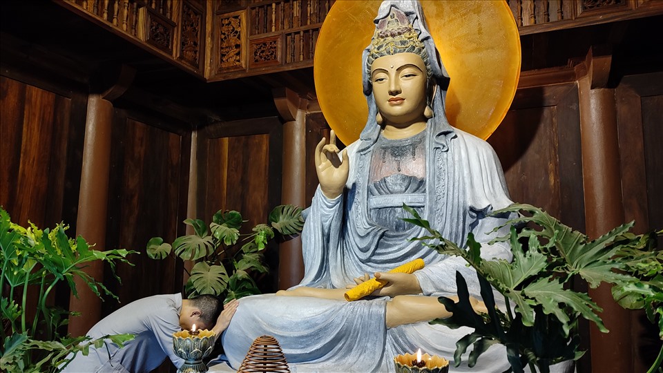 Particulièrement remarquable est la statue de Ksitigarbha, qui rayonne de bonté tout en demeurant majestueuse, parfaitement intégrée dans l'architecture d'ensemble qui marie subtilement les couleurs marron, jaune et blanc. Cette vision harmonieuse offre un sentiment de quiétude, faisant la pagode de Dia Tang Phi Lai un lieu de contemplation inoubliable.