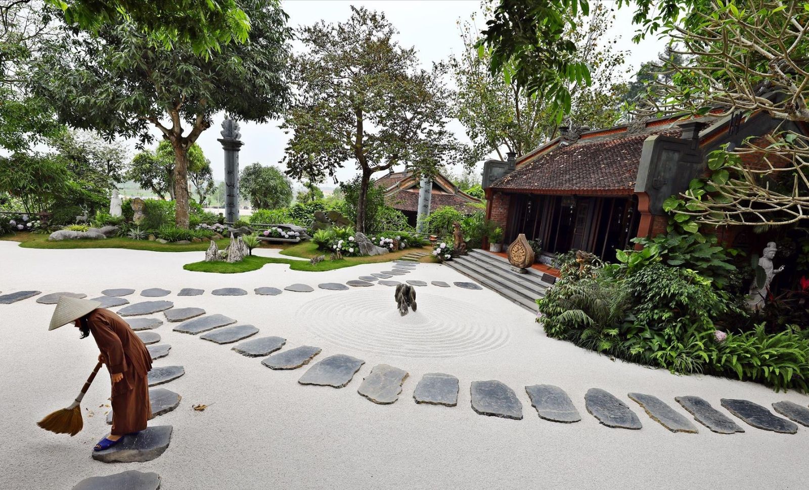 Pour les visiteurs qui découvrent cette pagode pour la première fois, une surprise les attend à l'entrée : la cour menant au temple est pavée de gravier blanc, un contraste saisissant avec les briques rouges typiques des autres pagodes. Just en face du temple ancestral, douze cercles sont minutieusement dessinés sur le sol en gravier, symbolisant les douze conditions et circonstances de la vie humaine. Les cailloux blancs portent en eux le sens de la méditation, et se promener dans cet espace immaculé apaise l'âme des visiteurs.
